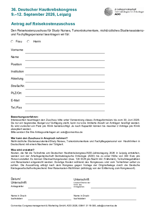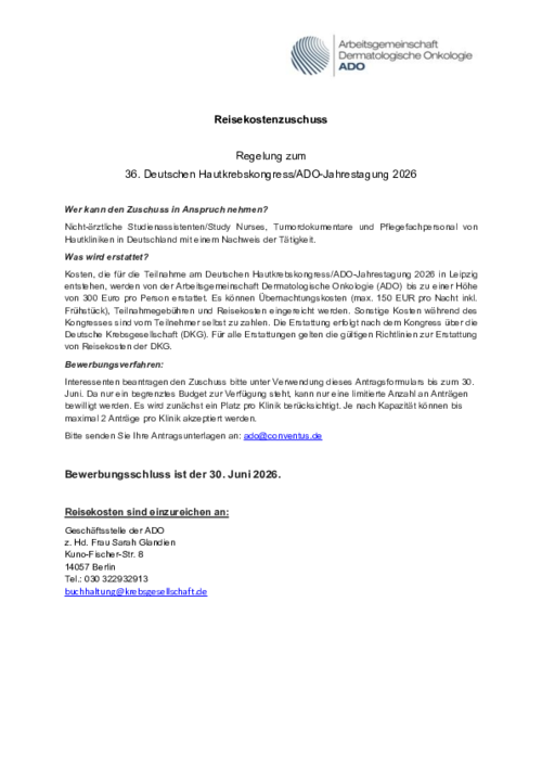 2026 fördert die ADO die Teilnahme am Deutschen Hautkrebskongress und stellt finanzielle Mittel zur Verfügung. Die ADO bezuschusst Ausgaben für Reisekosten und Übernachtung mit maximal 300 Euro pro Person. Die Auszahlung erfolgt nach dem Kongress gegen Vorlage der Originalbelege entsprechend der Reisekosten-Richtlinien der Deutschen Krebsgesellschaft (abhängig von der Entfernung zum Kongressort). Antragsberechtigt sind Study Nurses, Tumordokumentare, nichtärztliches Studienassistenz- und Fachpflegepersonal.